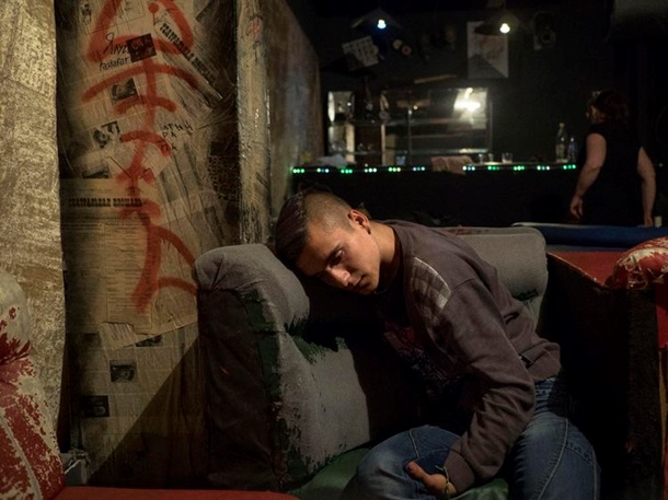 Фотограф рассказал, что когда они проезжали через украинские блокпосты, водитель прошептал пароль на ухо вооруженным охранникам. Мариупольский аэропорт превратился в укрепленный лагерь Национальной гвардии. Зал ожидания стал казармой, где неряшливые на вид солдаты спят и чистят оружие. Группа людей собралась вокруг старого черно-белого телевизора, по которому идет какая-то развлекательная программа. Стеклянные проемы заложены мешками с песком, говорит Сессини.