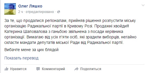 «За то, что продались регионалам , принял решение распустить городскую организацию Радикальной партии в Кривом Роге. Продажные шлюхи !! Екатерина Шаповалова с позором уволена с должности руководителя организации. Требую от всех пяти человек , которые предали избирателей , немедленно сложить мандаты депутатов городского Совета от Радикальной партии.