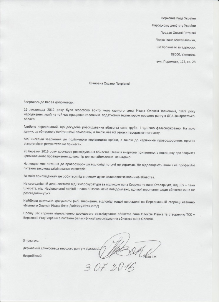 Также Иван Михайлович Ризак просит госпожу Продан способствовать созданию в ВРУ Временной Следственной Комиссии по расследованию убийства Алексея Ивановича Ризака: