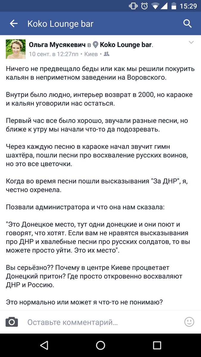 По её словам, это место является «притоном сепаратистов» в столице. Кроме песен про русских воинов, в зале звучали откровенные высказывания «за ДНР».