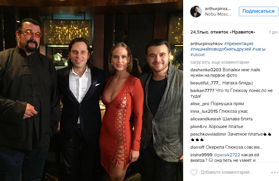 Знаменитость встретила Стивена в коротком красном платье со шнуровкой и откровенным декольте. В этот раз певица обошлась без нижнего белья, чем шокировала своих поклонников. Впрочем, сам Сигал не был недоволен компанией: на снимке, который выложил Александр Ревва в Instagram, актер заинтересованно смотрит на Наталью в то время, когда другие смотрят в объектив.